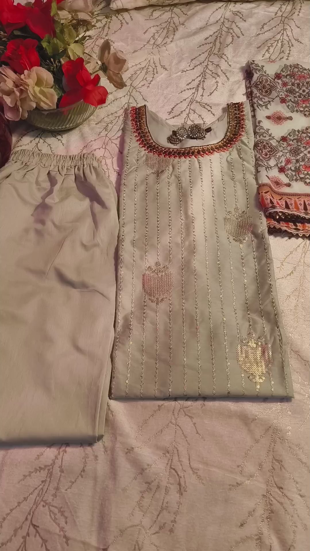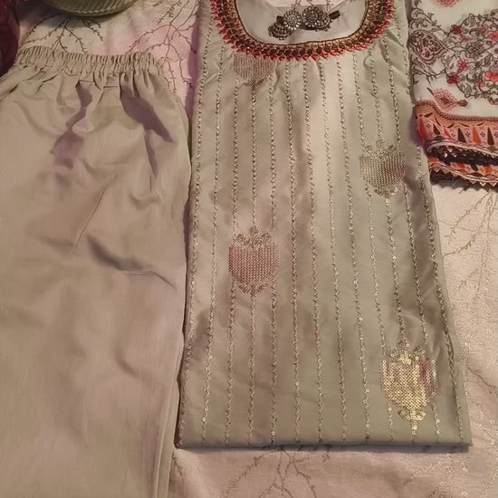Heavy embroidery and Tilla work Party wear 3piece cotton suit With Beautiful Printed Dupatta with matching purse. Size XL